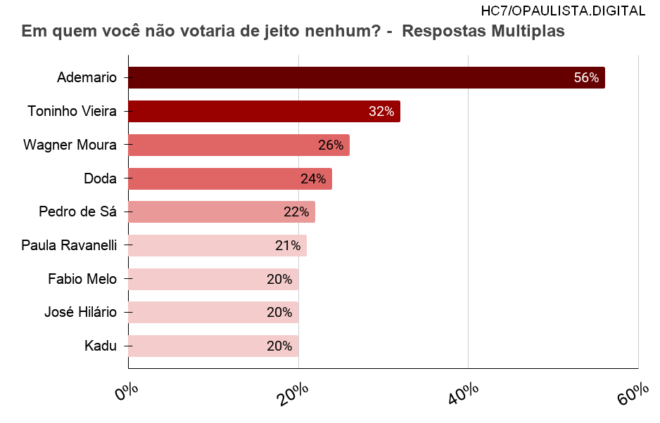 Quando o eleitor é perguntado em quem você não votaria de jeito nenhum?, O candidato Ademário dispara e tem a maior rejeição, 56%, seguido por Toninho Vieira, que aparece com 32%, o candidato Wagner Moura tem 26%, Doda tem 24%, Pedro de Sá 22%, Paula Ravanelli 21%, Fabio Melo e José Hilário e Kadu aparecem com 20% de rejeição.