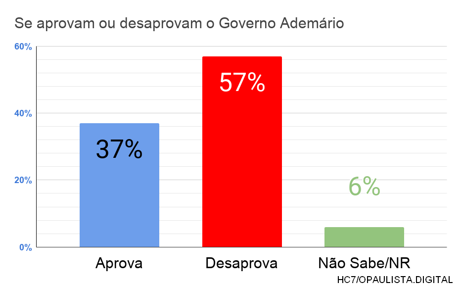 Quando perguntados, se aprovam ou desaprovam o Governo Ademário, 37% APROVA e 57% DESAPROVA, Já os que Não Sabem ou Não Responderam, somam 6%.