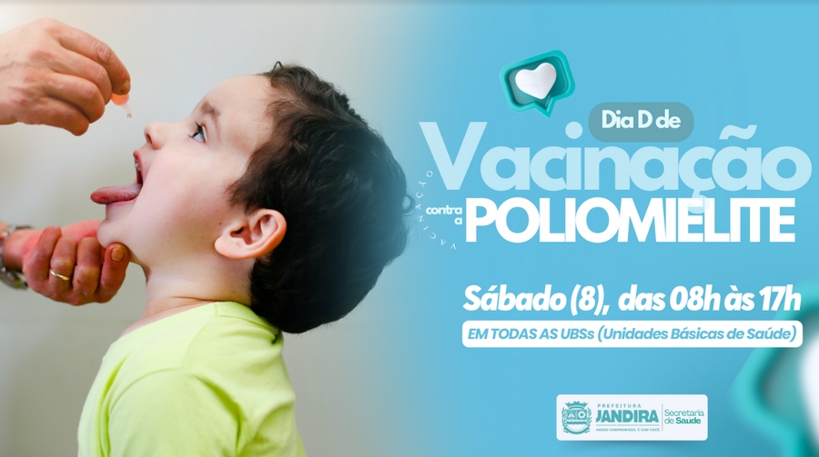 Neste sábado (08), a Prefeitura de Jandira realizará o Dia D de Vacinação contra a Poliomielite. O imunizante está disponível para todas as crianças de até cinco anos. Basta o (a) responsável comparecer à UBS (Unidade Básica de Saúde) mais próxima da residência, das 08h às 17h, com documento oficial e caderneta de vacinação.